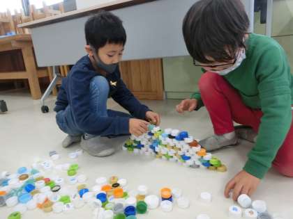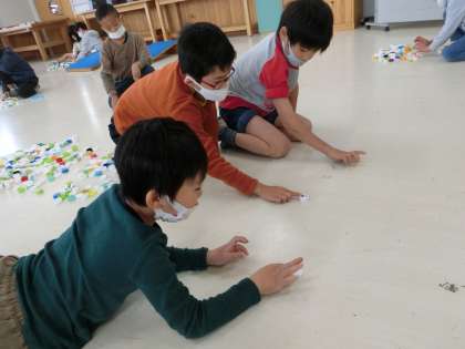今日は,「キャップ」を使って遊びました。前回の学習を生かしながらキャップを積み重ねたり,新たにキャップをはじいたりして遊びました。キャップをはじく際には,キャップを立て,指で押さえて前に飛ばすと,少しだけ自分の所に戻ってくるという発見がありました。