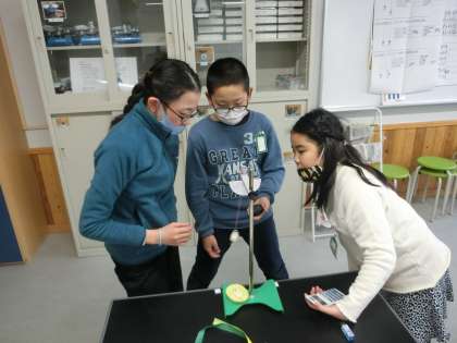 理科室を覗いてみると,5年生がふりこの学習をしていました。今日の学習問題は,「ふりこの1往復する時間は,何によって変わるのだろうか」です。ふりこの長さ?ふれはば?おもりの重さ?と予想を立てて実験をしていました。条件をそろえながら集中して実験することができていました。