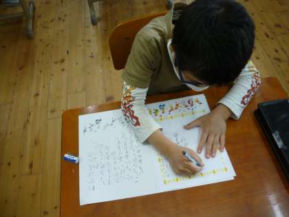 国語科の学習で「てがみをしらせよう」をしました。新1年生を御所東小学校に招待し,「あきのたからものパーティー」をするので,その招待状を書きました。いつもよりも一文字一文字を丁寧に気持ちを込めて書いていました。「新1年生に会うのが楽しみだな」と言いながら,表紙にはニコニコ笑顔の自分と新1年生,そして秋のたからものを描きました。「あきのたからものパーティー」が待ち遠しい1年生です。