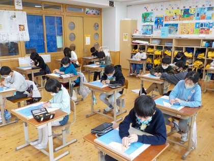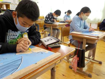 4年生は初めての木版画に挑戦しています。彫刻刀も約束を守って,慎重に扱っています。使い方も少しずつ上手になってきました。