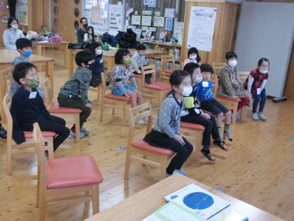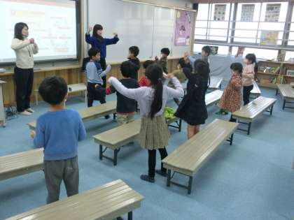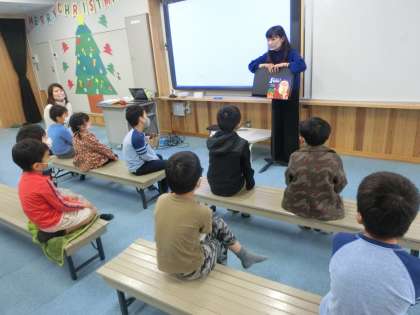 年長・1年生のクラスでは,クリスマスにちなんだ本の読み聞かせでした。英語教室では英語を使って,読解教室では日本語で行われていました。子どもたちの頭の中は混乱していなかったかな?先生たちが本を読む声に耳を澄ませて一生懸命に聞いている姿が印象的でした。また,英語教室では,「Turn around」「Thump your chest」と発声しながら体を動かして言い方の練習もしました。