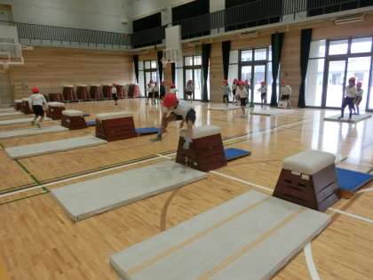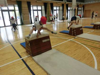 跳び箱あそびの学習で,跳び箱を縦向き,横向きにした開脚跳びに挑戦しています。子どもたちは,勢いよく助走し両足踏み切りをして跳び越えていました。踏み切りの仕方,手の付き方に注意して意欲的に取り組んでいました。