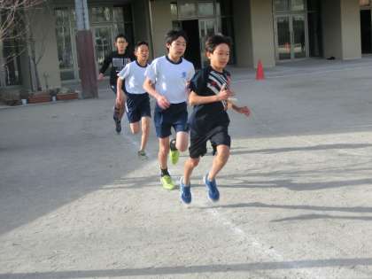 今年度は,大文字駅伝がありません。その代替大会に向けて校内記録会をしました。グランドを大回りして1周100mを10周走ります。今日はとても冷たい風が吹いていてコンディションとしてはよくありませんでしたが,みんな力一杯に走っていました。結果はどうだったでしょう。風を切って力強く走る姿がかっこよかったです。