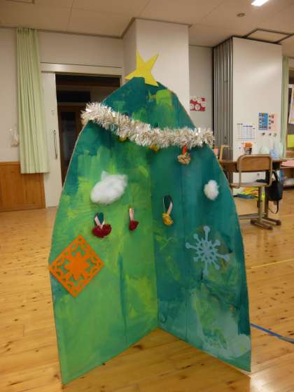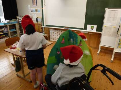 図画工作の時間に塗りたくりをして作った「3くみの木」に,生活単元学習の時間で作った新聞粘土のオーナメントを飾りました。モールや綿も一緒に飾りました。モールはみんなで協力して持って,木に巻いていきました。「3くみの木」がきれいに飾りつけられて,教室が一気にクリスマスの雰囲気になりました。