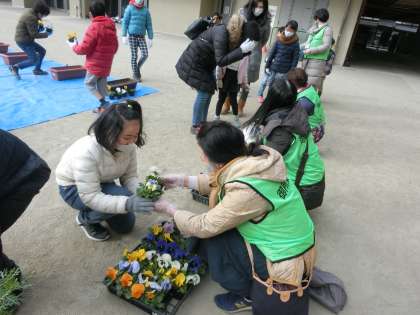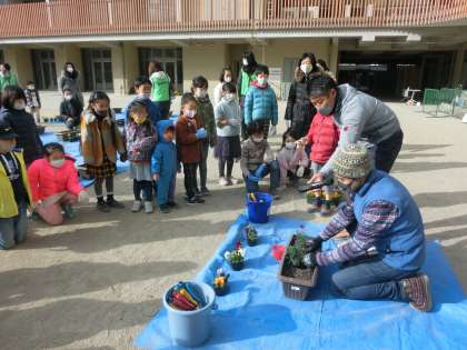 まずは,お花選びからです。花は,パンジーとマーガレットの2種類。好きな色の花を選んで,植え方を教えてもらいました。プランターの中心にはマーガレットを置いて,後は好きな位置にパンジーを植えます。土を軽く掘ってポットから優しく苗を出して植えるようにします。