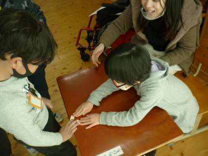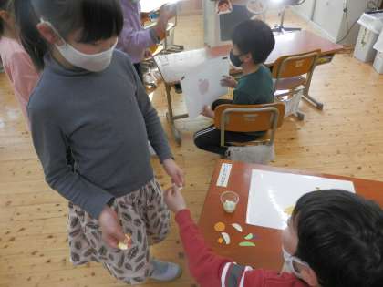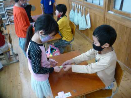 英語活動の学習で「クリスマスケーキをつくろう」をしました。今回は,お店屋さんとお客さんに分かれて,自分のほしい果物を相手に伝える学習です。「Peach please.」「How many?」などと英語でやり取りをして,果物をもらったときはみんな嬉しそうでした。「たくさんの果物の名前を言ったり,英語を話すことが楽しいな」と言っている子もいました。たくさんの果物をもらえて,みんな大満足でした。
