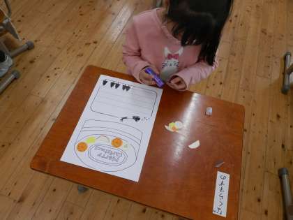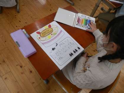 果物をもらったあとは,クリスマスカードに飾り付けをしました。「おいしそうなクリスマスケーキが出来た。食べたいな!」と言っている子もいました。クリスマスカードには,お家の人にメッセージを書いています。毎日頑張っている1年生の気持ちがたくさんつまっています。お家で見てあげてください。