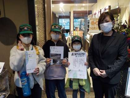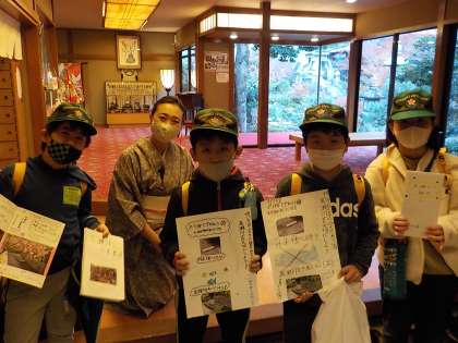 (写真は,終業式の日の様子です。総合の学習でお世話になったお店の方々にお礼を伝えに行きました。感想を書いていただいた方もおられて,子どもたちはとても喜んでいました。子どもたちの学びのためにご協力いただいて,本当にありがとうございました。)