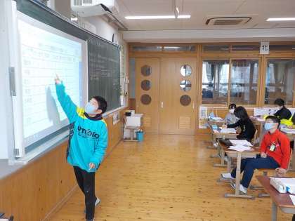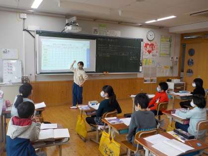 算数の学習で,「1週間のけが調べ」のデータを表に整理したり,整理された情報を読み取ったりしています。黒板の掲示を使って,みんなに伝わるように読み方を説明することもできました。