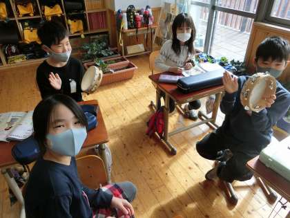 音楽科「いろいろな楽器の音をさがそう」の学習では,様々な楽器の音を組み合わせてリズムを楽しみました。ウッドブロック,クラベス,タンブリンなどの打楽器を使って,4パターンのリズムを叩きました。
