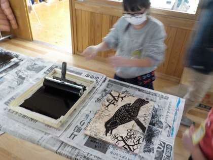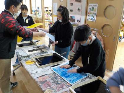 ほってすって見つけて(4年) 公開日 2021/01/20 更新日 2021/01/20 4年生 初めての木版画に挑戦している子どもたち。これまで頑張って彫り進めてきた作品を,いよいよ刷りました。完成した作品を見て「うまくできた!」と満足気な表情をしていました。 作品は図工展で展示します。楽しみにしていてください。