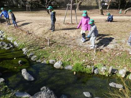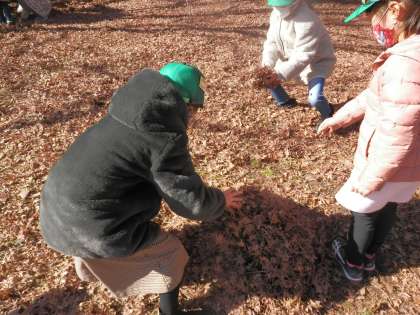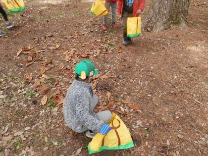 2学期に御所へ行って,秋の宝物を拾ったので「ありがとう」の気持ちを込めて,御所へ返しにいきました。「また秋になったら,遊びたいな」と言っている子もいました。その後,夏,秋と訪れた場所だったので「冬さがし」をしました。「風が冷たいよ」「木に葉っぱがついていないから,木が寒そうだね」「葉っぱがふかふかの毛布みたい」と言いながら,冬を感じることができました。それぞれの季節で,素敵なところをたくさん見つけることができていました。
