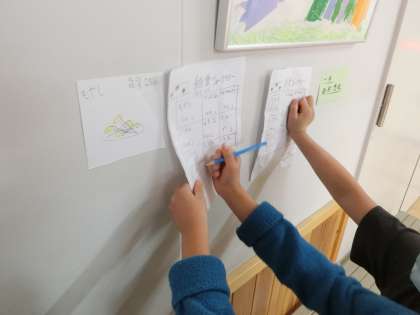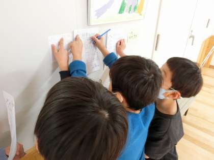 給食委員会が考えてくれた「給食ラリー」が始まりました。子どもたちに記入用紙を配ると,さっそく休み時間に取り組んでいました。校内の階段やオープンスペースに貼られている絵を探しながら,友達と楽しそうに必要な言葉や数字を用紙に書き込んでいました。