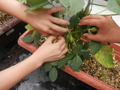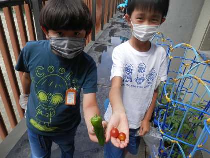 夏野菜を育てて,2か月がたちました。野菜はぐんぐん育って,たくさんの実をつけるようになっています。自分が育てている野菜が,きれいな緑色のピーマンや,おいしそうな赤いトマトになっているので収穫すると大喜び。