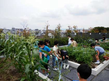 屋上の畑の野菜も日に日に大きくなっています。とうもろこしは,みんなの身長を抜かし,かばちゃのつるは柵を超えるくらいぐるぐると伸びています。「毎日屋上に来て観察したい!」と,自分たちが育てている野菜を大切にしている2年生。立派な野菜がたくさんできるといいですね。