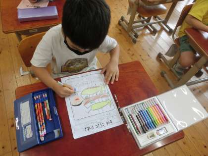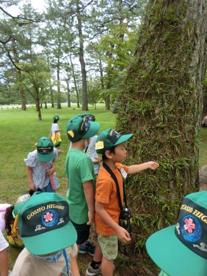 ごしょへ いったよ4(1年) 公開日 2021/07/14 更新日 2021/07/14 1年生 最後に,葉っぱが生えている木を見つけました。「どうしたら,木から葉っぱが生えてくるんだろう」と不思議でいっぱいでした。たくさんの生き物,植物を見つけ,自然をいっぱい感じることができた「ごしょ」へ「また行きたいな」「みんなで『ごしょたんけん』がしたいな」と話していました。