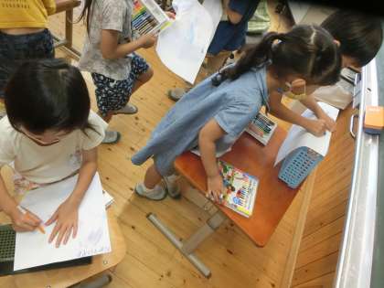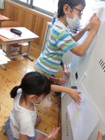 図画工作の時間に,身の回りにある「でこぼこ」を見つけて,形を写し取る学習をしました。教室のオルガンや棚,廊下の扉など,どんどん「でこぼこ」を見つけていきました。教室の棚は,「長四角が順番に続いて,横断歩道みたいだな」,教室のカゴは,「四角でチョコレートみたい」など,形が何に見えるかにもイメージを広げながら,楽しんで写していました。