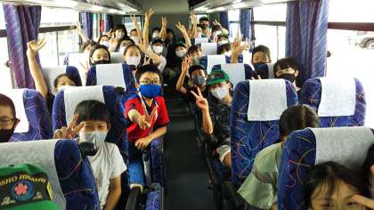 渋滞もなく、鈴鹿インターにつきました。バスの中は涼しくて快適です。みんなとてもいい笑顔です。