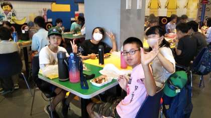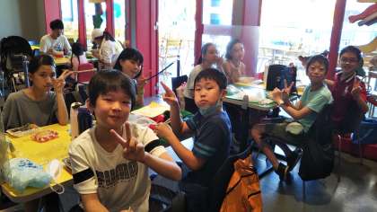 昼食タイムです。家族の方が朝早くから作ってくださったお弁当を班に分かれていただきました。
