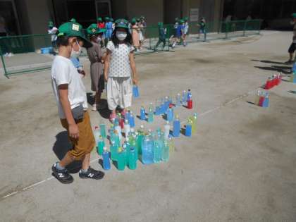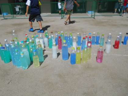 夏の日差しの下で,色水を置いたり並べたりして,