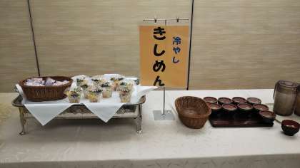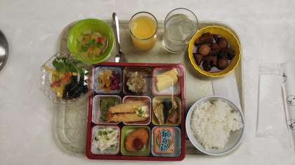 朝食の時間です。お弁当と自分の好きな物を選んでいただきます。