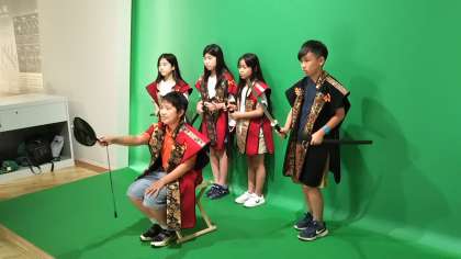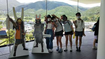 武将の服を着てハイ、ポーズ。展望台からは関ヶ原の町がよく見えました。