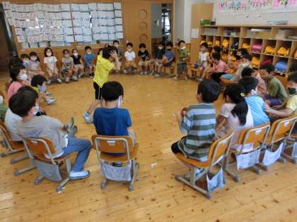 今日は,1学期最後の日。みんなで「フルーツバスケット」をして遊びました。「カレーが好きな人」や「水色の服の人」「フルーツバスケット!!」と元気いっぱい楽しんでいました。