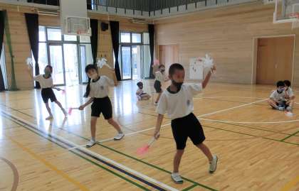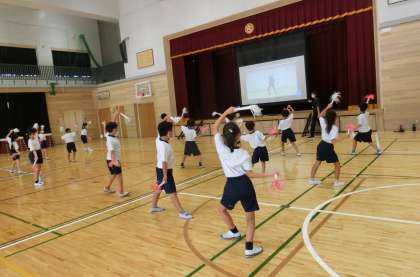ダンスの練習 公開日 2021/08/30 更新日 2021/08/30 2年生 2年生は体育館でダンスの練習を始めています。手には,紅白の房の付いた棒を持って踊ります。映像を見ながら左右どちらに動くのか確認して楽しく練習することができました。もっともっと練習してかっこよく踊れるように頑張ります。