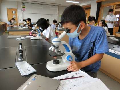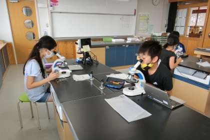 顕微鏡をのぞいて (5年) 公開日 2021/08/30 更新日 2021/08/30 5年生 顕微鏡を使ってアサガオの「花粉」の様子の観察です。表面が凹凸になっていることやとげとげした形をしていることなどじっくりと観察してカードに記録していました。一人一人の集中する姿が素晴らしかったです。