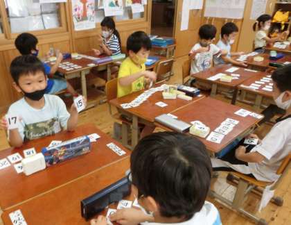 10より大きいかず(1年) 公開日 2021/09/06 更新日 2021/09/06 1年生 算数科の時間は「10より大きいかず」の学習をしています。今日は,「10より大きいかず」を数図ブロックを使って並べたり,数カードを使って,「大きさくらべ」をしたりしました。「どちらが大きいでしょう」「どちらが小さいでしょう」「正解!!」と楽しく「大きさくらべ」ができました。