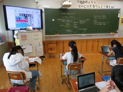新聞を読もう(5年) 公開日 2021/09/09 更新日 2021/09/09 5年生 新聞記事の書き方で「逆三角形の構成」になっていることを学びました。この日は,全国紙と京都で発行されている新聞に載っている同じ記事の読み比べです。見出しに注目することで,それぞれの記事がどのようなことを伝えたかったかを知ることもできました。