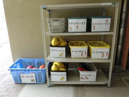テラスの塀に的を作って色球を入れる輪っかも作りました。高い位置にあるので,そう簡単には入りませんがみんな楽しく遊んでいます。楽しく遊びながら体力をつけていってほしいと思います。