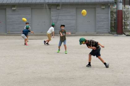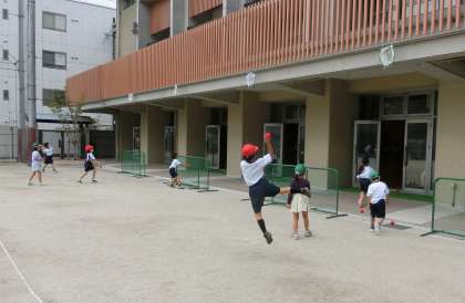 ラグビーボールや色球,鉄棒の逆上がり補助具などを新しく準備しました。子どもたちは休み時間にそれらを使ってルールを守り,楽しく遊んでいます。ラグビーボールは,今まで使っていた丸い形と違い,地面に落ちるとどんなふうに跳ね上がってくるか予測がつきません。どうもそれが楽しいようです。