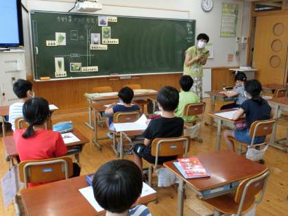 1学期の給食には,万願寺とうがらしや加茂なすが出てきましたが,その他にもたくさんの京野菜があります。栄養教諭の野秋先生が見せてくださった写真を見ながら,「見たことはあるんだけど,なんていう名前だったっけ?」と首をかしげながら考えていました。京野菜には,たくさんの栄養が含まれているので,しっかり味わって食べたいという思いをもっていました。
