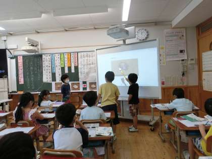 国語科で「うみのかくれんぼ」を読んで,海の生き物がどのように隠れているか,文章と写真を見ながら考えました。「名前」「隠れる場所」「体の特徴」「隠れ方」をワークシートに書き,映像を見て,その様子を説明することができました。一生懸命に学習する姿が,とてもかっこいい1年生です。