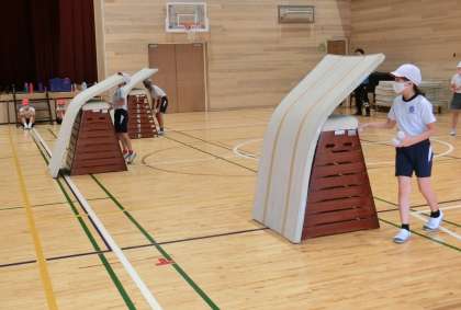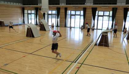一人の持ち球は5球。相手チームの陣地奥にあるボールを取りに行きます。前に出たいけれど攻め方を間違えると当てられてしまい,陣地奥までは辿り着けません。実践を重ねながら作戦を立てています。やっていく中でルールの確認や変更があり,5年生ならでは競技になってきています。