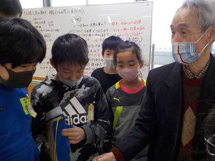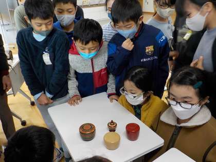 お話とインタビューの最後には,実際に作られた漆器を見せていただき,子どもたちは目を輝かせながら作品を見ていました。