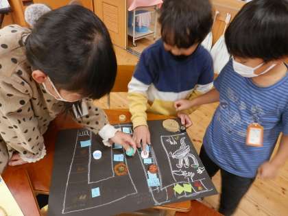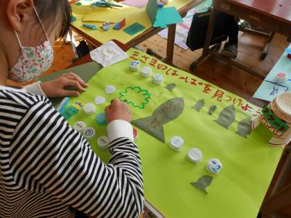 図画工作科で「わくわく おはなし ゲーム」の学習をしました。お話を作ったり,材料から考えたりしながら,みんなで遊ぶゲームを考えました。「学校に行く時のことをお話にしてみよう」「緑は,葉っぱに使える。葉っぱの形に切ろう!」と想像したお話をもとにゲームを作っていました。完成した後は,みんなで遊んでとても楽しそうでした。