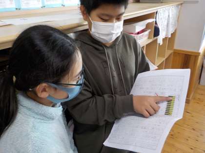 国語科で,自分の考えに合った資料を選び,構成に気をつけながら考えを書く学習をしています。今日は,これまで書き進めてきた自分の文章を友達に読んでもらいながら,推敲しました。