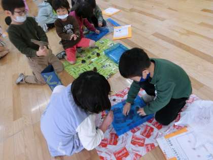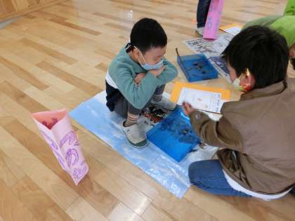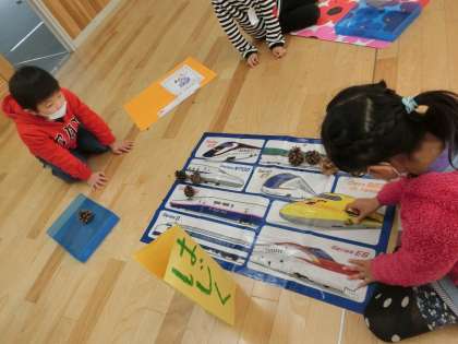 「はじく」「うつ」「こする」「さがす」「なげる」など,遊び方によって,いろいろな楽しみができ,みんな夢中になって,「秋の宝物」で遊んでいました。17日(金)に,新しい1年生が「秋の宝物屋さん」に遊びに来てくれます。「新しい1年生のために,もっと秋の宝物をたくさん使って遊ぼう」「難しいコースは,ちょっと難しいコースにした方がいいかな」と新しい1年生が楽しんでくれるようにしようと,とても楽しみにしています。