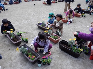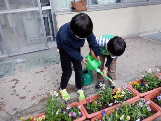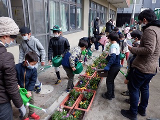 最後に,出来上がったプランターを並べてみると,本当に「花いっぱい」で,水やりをした水がキラキラと光ってとても綺麗でした。