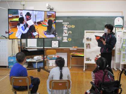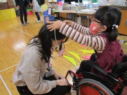 段ボールランドにお客さんが来てくれた時には,遊びが終わるとバッジや首飾りをプレゼントしました。皆さん,喜んでくれました。お客さんが帰られた後に,自分たちの活動の様子を動画で振り返りました。思っていたよりも上手に話せていた,昨日よりも大きな声で掛け声をかけることができた,など色々な感想が聞かれました。明日の学習に生かしたいと思います。