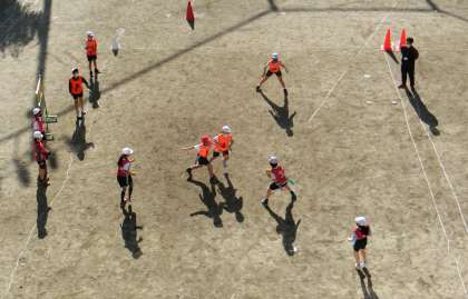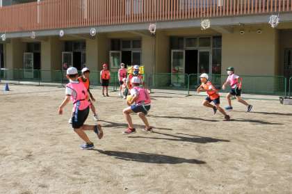 タグラグビー (4年) 公開日 2021/12/09 更新日 2021/12/09 4年生 体育の学習でタグラグビーをしています。子どもたちは,みんなタグラグビーが大好きです。ルールやゲームの進め方に少しずつ慣れてきています。楕円形のボールのパスの仕方やボールを持たない時の動きなど作戦をもとにチームで声をかけ合ってがんばっていました。