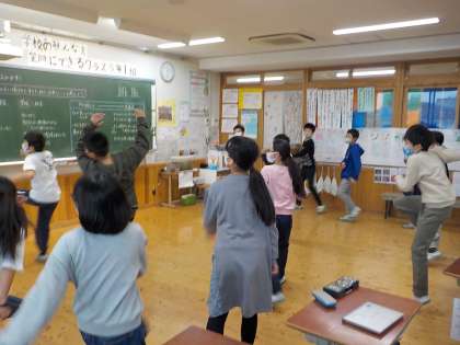 足が速くなるダンス(5年) 公開日 2021/12/10 更新日 2021/12/10 5年生 5年生は来週,「足が速くなるダンス講座」に参加します。そこで当日に向けて,足が速くなるダンスが踊れるように,動画を見ながら練習しています。 踊り始めた頃は「難しい〜」「自信がない・・・」などの声が聞こえてきていましたが,足が速くなれるなら頑張らないと!と練習を重ねているうちに,ずいぶん上手に踊れるようになってきました。 当日は元陸上選手の朝原さんが来てくださる予定です。楽しみです。