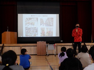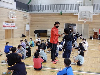 最初に,北京オリンピックメダリストの朝原宣治さんから「目標に向かってチャレンジ!」というお話を聞きました。目の前でメダリストの話が聞けるということで,子どもたちの目は終始きらきらとしていました。講演の中で,朝原さんが失敗をバネにしてメダリストになったことや,仲間との信頼関係を構築することの大切さについての話もあり,「これから夢に向かって自分がどう行動するのかが大切なんだな。」と,自分の夢についてもう一度考えている様子が見られました。講演の最後には,銀メダルを見せていただき,表と裏を見比べながら,「こんな模様が描かれているなんて知らなかった。」と,とても嬉しそうにしていました。