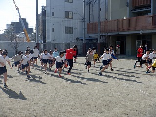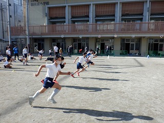 腕を速く振るコツや,足のストライドや回転数を意識して練習することなど,ただやみくもに走るだけでなく,どういった姿勢で走ったり,何を練習したりすると速く走れるようになるかを教えていただきました。四つ這いで走ったり,後ろ向きで走ったり,今までやったことのない練習の仕方に子どもたちは驚いていましたが,朝原さんたちの実技を見て,「おもしろそう。」や「もっとできるようになりたい。」とどんどんチャレンジしていました。朝原さんに「みんな才能あるよ。」と言っていただき,「教えてもらったことを大切に,これからも速く走れるように頑張ります。」と最後の挨拶で感想を伝えていました。(今日の取組の様子は,11時55分のKBS京都ニュースで放送されました。)