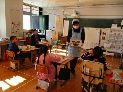 給食時間に,栄養教諭の野秋先生にお雑煮の写真を見せてもらい「この料理の名前は何でしょう。」「京都でよく食べられる餅の形は丸でしょうか,四角でしょうか。」という問題に挑戦しました。餅の形は,3人とも大正解でした!!(答えは丸です。)