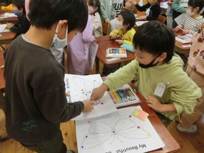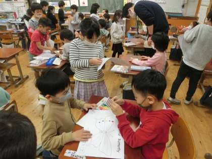 英語活動「Beautiful butterflyを作ろう」の学習では,pink,yellow,blue,purple,orangeなど,いろいろな色を英語で言う学習をしました。お店やさん役とお客さんに役に分かれて,自分がほしい色のお店に行きます。元気な声で「Green,please」と言えていました。「OK!」と言ってもらうとうれしそうで,「Thank you」など英語でやりとりができました。いろいろな色のシールをもらい,とってもすてきな「Beautiful butterfly」ができて,みんな大満足でした。