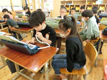 正しく吹けているかな (2年) 公開日 2021/12/22 更新日 2021/12/22 2年生 鍵盤ハーモニカをしました。曲名は,「小ぎつね」です。階名唱をした後に,ペアになって練習を聞き合いました。指使いは正しくできているかな?息の吹き方は大丈夫?よく聞いてアドバイスし合いました。みんなとても集中していました。