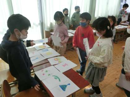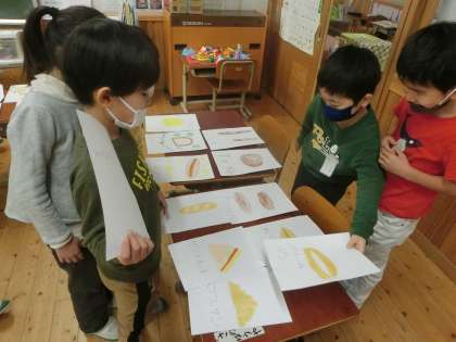 国語科「ものの名まえ」では,名前には,「一つ一つの名前」と「まとめてつけた名前」があることを学習しました。それを生かして,開きたいお店を考えて「おみせやさんごっこ」をしました。パン屋さん,お花やさん,乗り物屋さん,本屋さんなどすてきなお店がいっぱい開かれました。